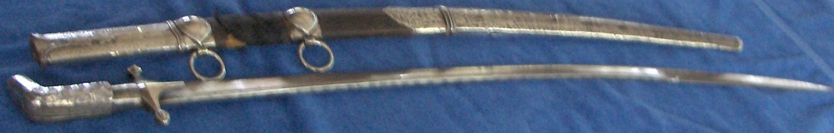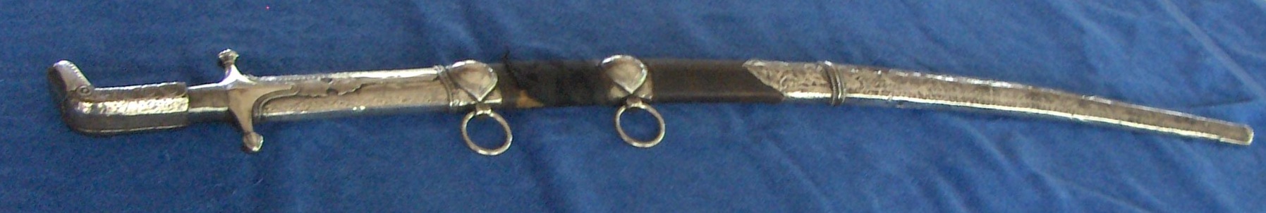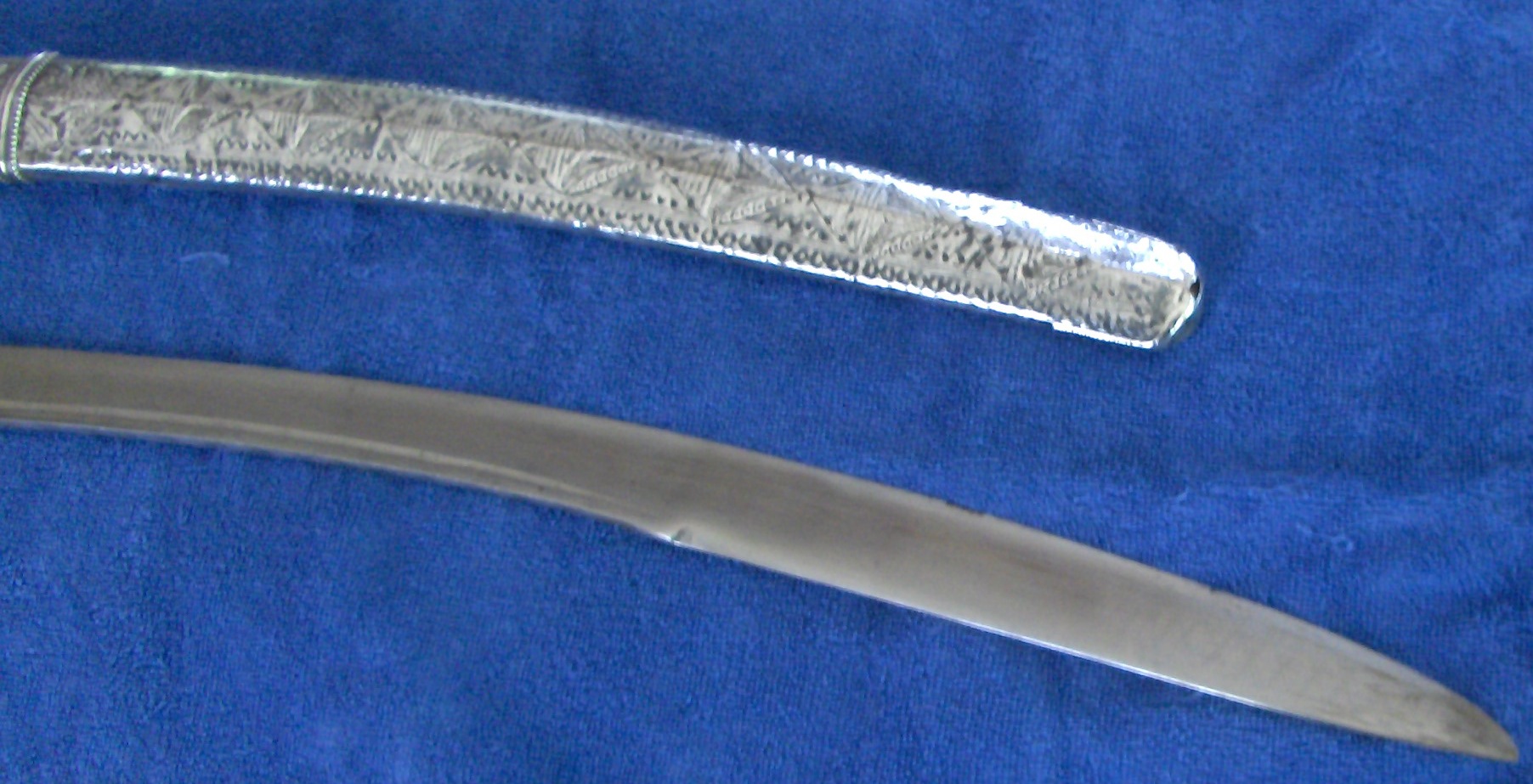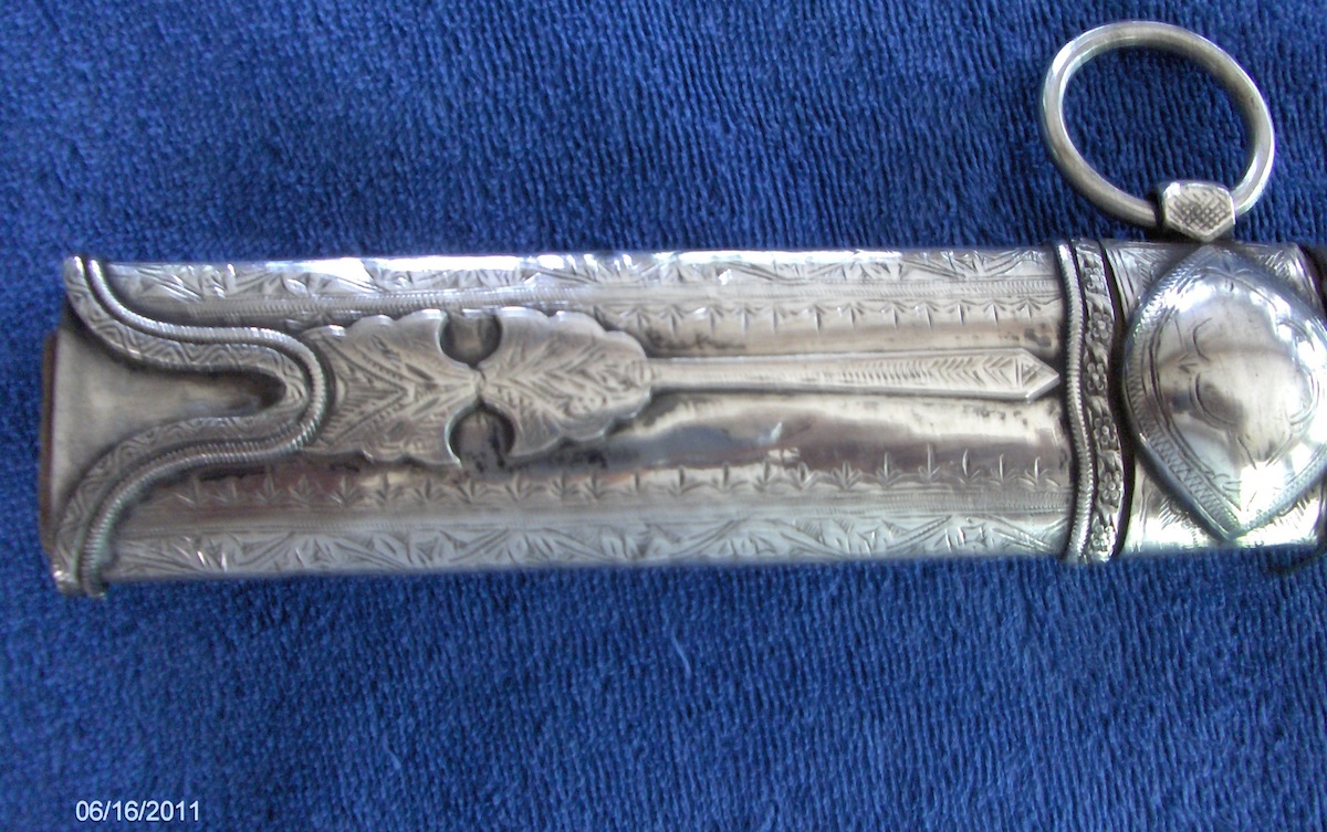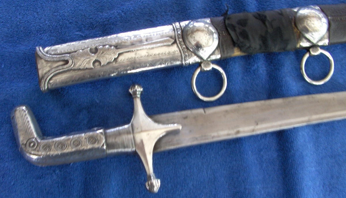 36.5 inches long Imported European tempered carbon steel blade with its metalwork mark amd with its matching polished silver sheath adorned with hand-made elaborate cursive and calligraphic Islamic geometric designs Estimated Value $6,000.00 Click HERE to make an offer on this item |