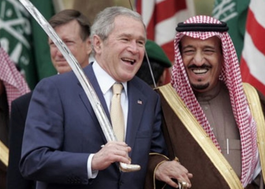 President Bush on his 2008 visit to Saudi Arabia holding a Saudi sword with Saudi Prince Salman. |
