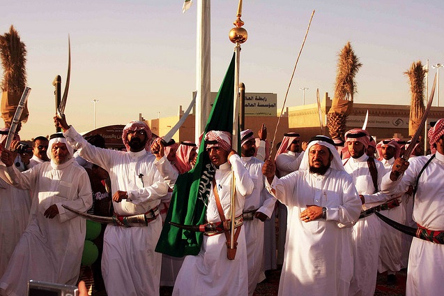 The Saudi King’s Elite (King’s Guard) in their traditional dress banishing their swords. |